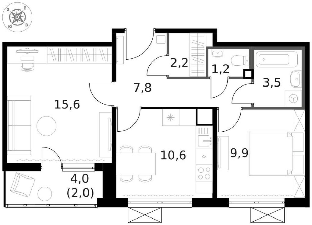Общая: 53,2 м2